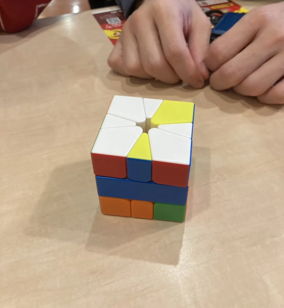 普通のルービックキューブは面が平行に切断されていますが、このスクエア1は、正立方体の状態で上面と下面が「三角形」や「凧形(Kite shape)」に切断されているのが特徴です。 そのため、回していくと直方体や立方体の形が崩れていき、元に戻すのが非常に難しい!